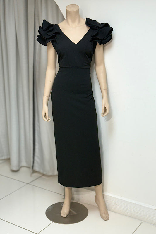Ruffle Shoulder V-Neck Midi Dress