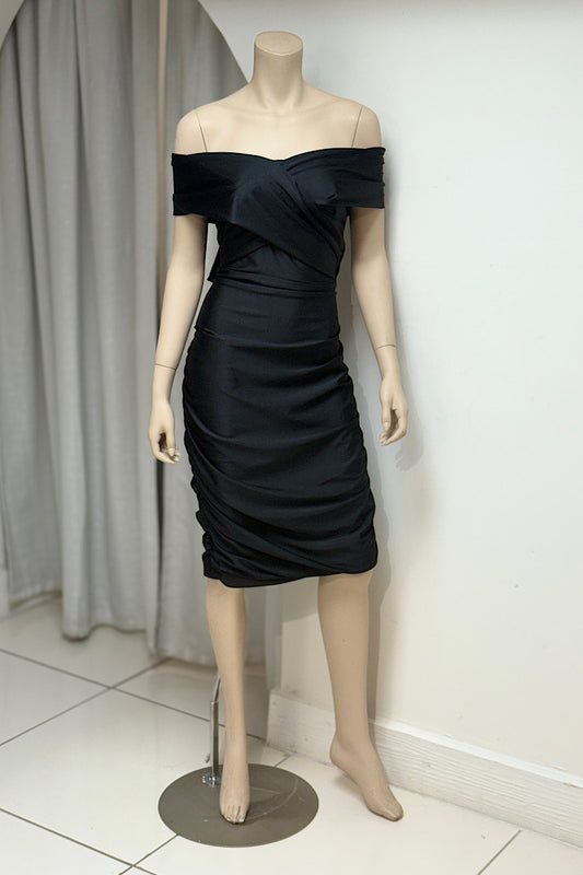 Off Shoulder Fitted Stretched Midi Ruched Dress