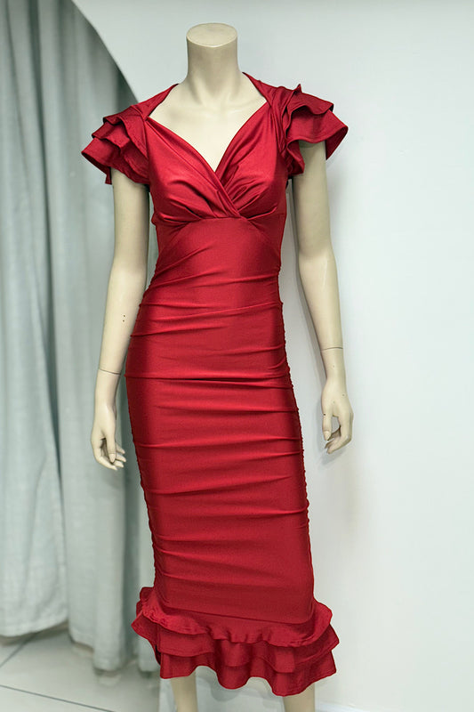 V-Neck Fitted Ruched Midi Dress