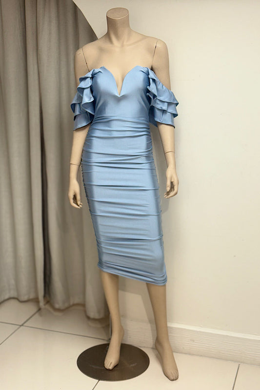 Off Shoulder Fitted Stretched Midi Ruched Dress