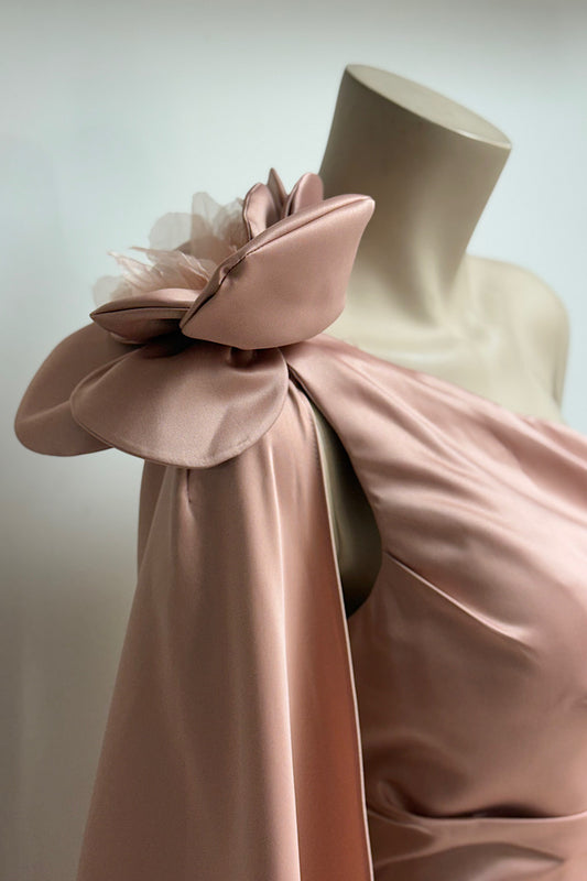One-Shoulder Rosette Cape Sleeve Satin Formal