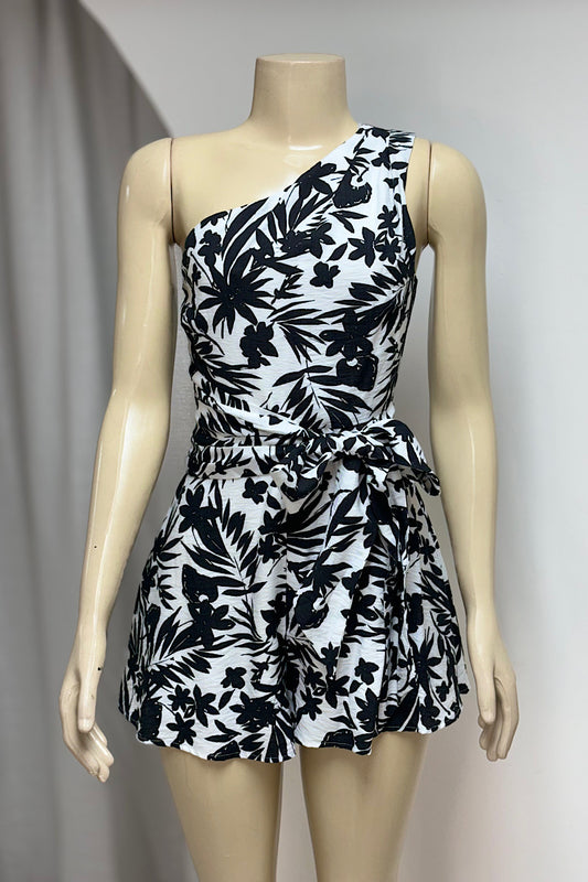 One-Shoulder Tropical Linen Romper