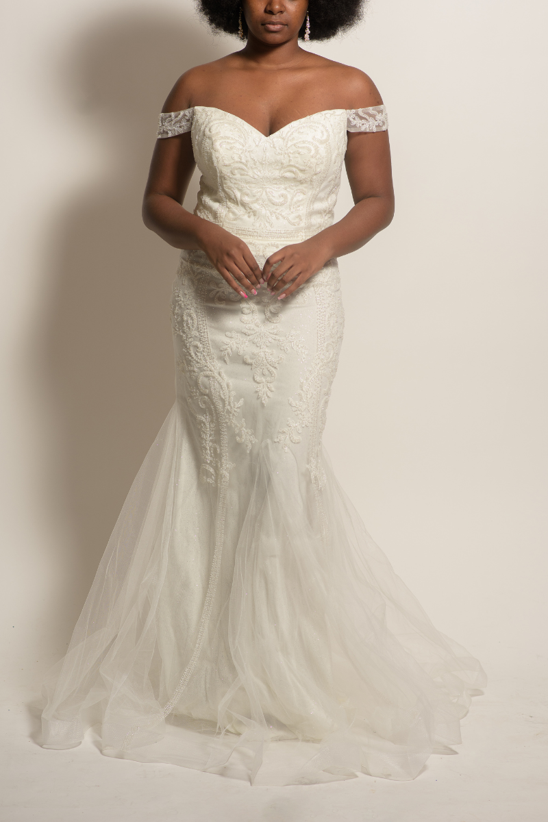 Celebrate your special day in the Off-Shoulder Beaded Formal wedding dress. This stunning mermaid gown features elegant off-shoulder styling, intricate beaded embroidery, and delicate white beads, perfectly tailored to highlight your curves with timeless sophistication.