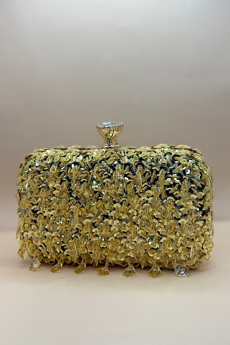 Add a touch of sparkle to your outfit with our Beaded Sequin Rhinestone Clutch. The dangling beads and sequin detailing make this accessory perfect for any special occasion. Choose from two elegant colors, gold or red. Elevate your style with this glamorous clutch.
