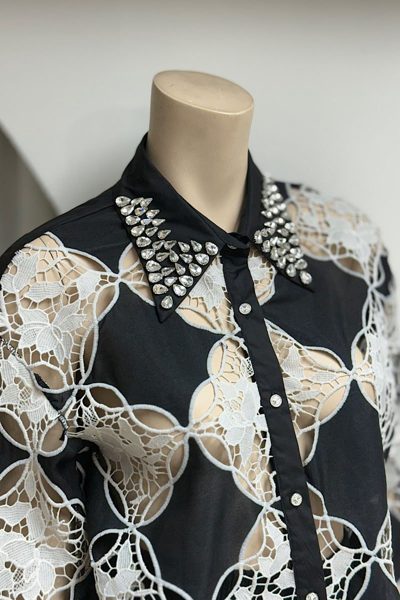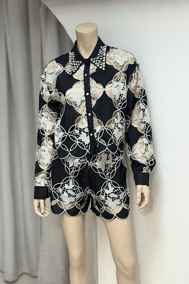Stand out with the Embellished Collar Lace Short Pant Set, featuring a striking rhinestone collar and a bold black-and-white pattern. This stylish set combines elegance and modern flair, perfect for making a confident statement wherever you go.