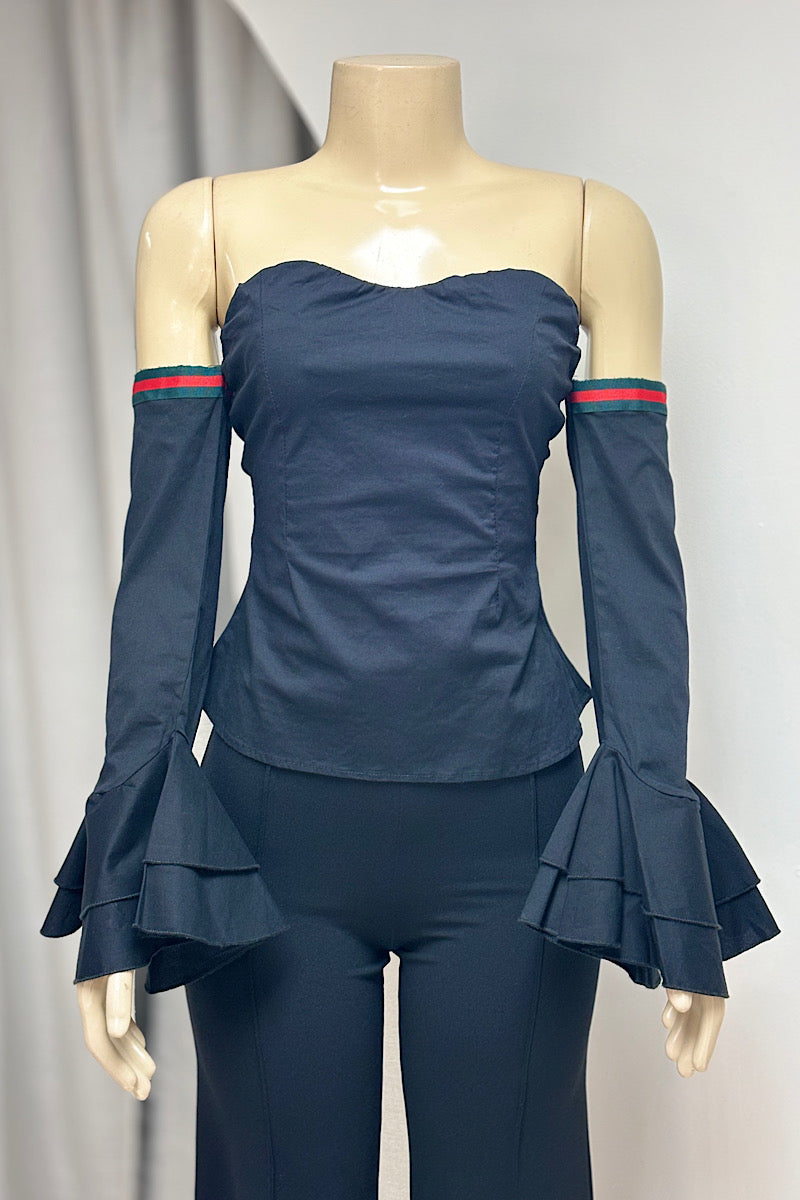 Elevate your style with the Off-Shoulder Striped Detail Top featuring green and red stripes on the shoulder. This fitted, one-size-small top combines playful ruffle details with a flattering off-shoulder design, perfect for adding a chic touch to any outfit.