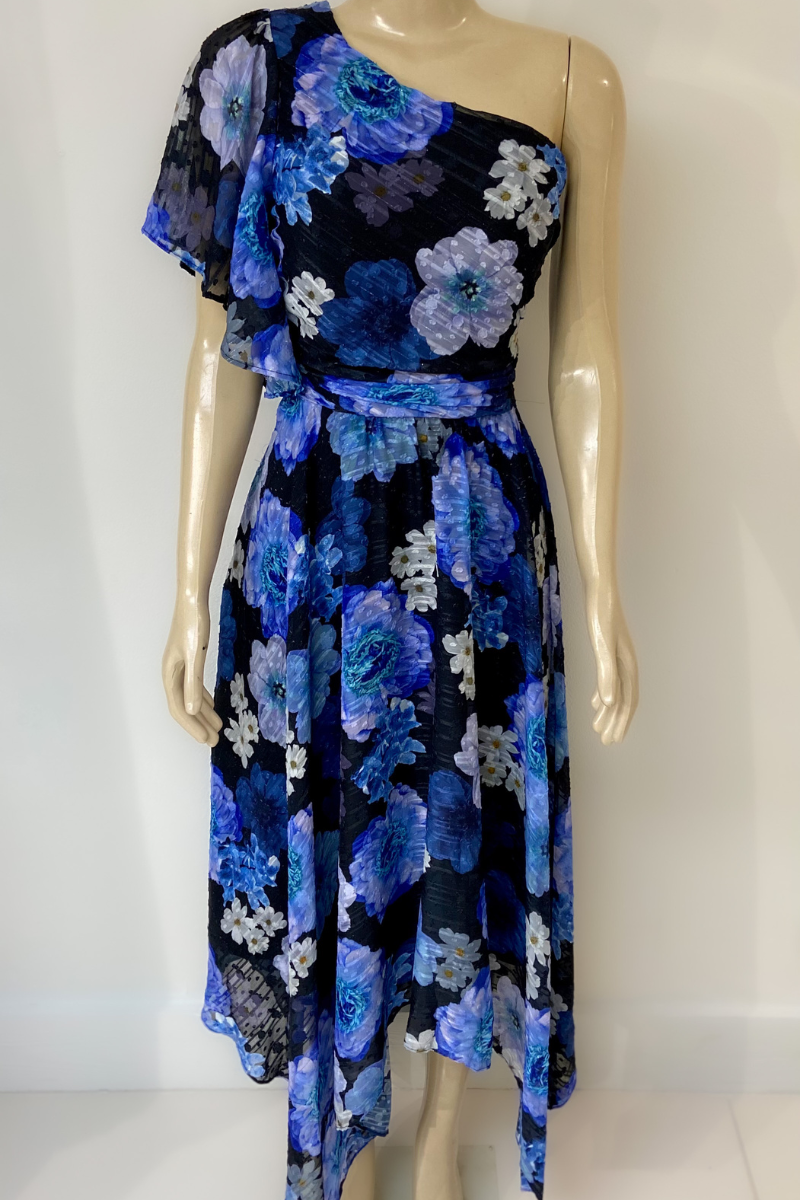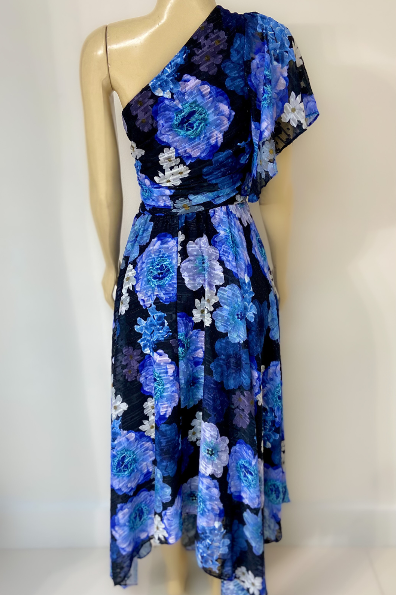 Embrace a garden of elegance in our midi-length floral blue dress, boasting a chic one-shoulder bodice and a playful handkerchief skirt.