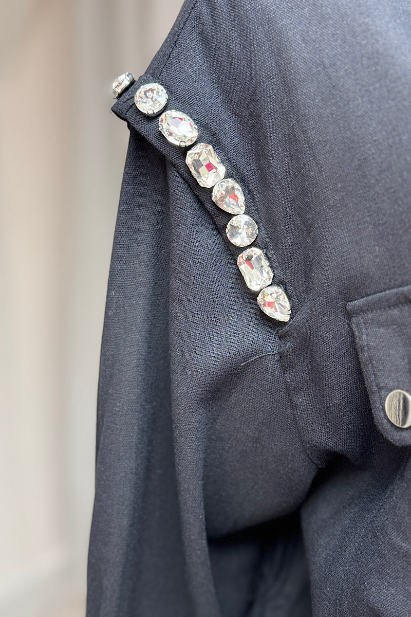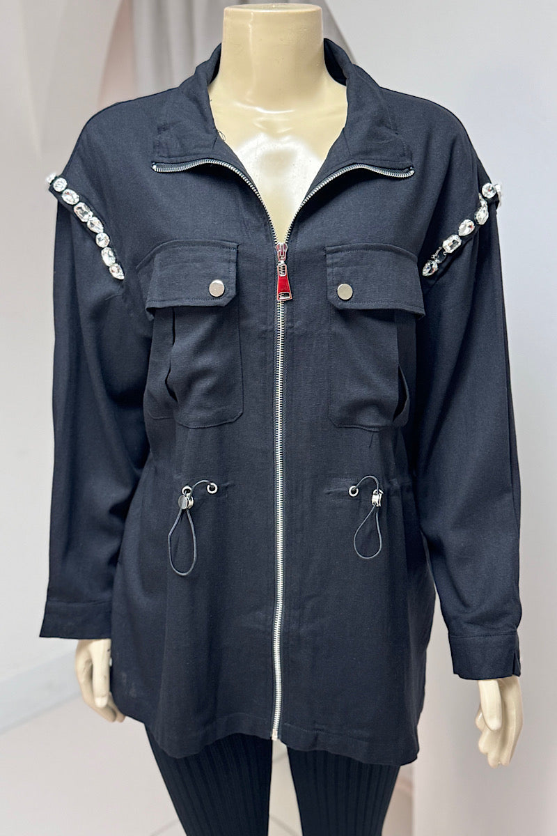 The Embellished Cargo Jacket expertly merges functionality and style, featuring robust silver hardware that enhances durability and a polished look. Its rhinestone accents provide a refined touch, elevating the classic utility design. This jacket is an ideal choice for those who value practicality without compromising on sophisticated detail.