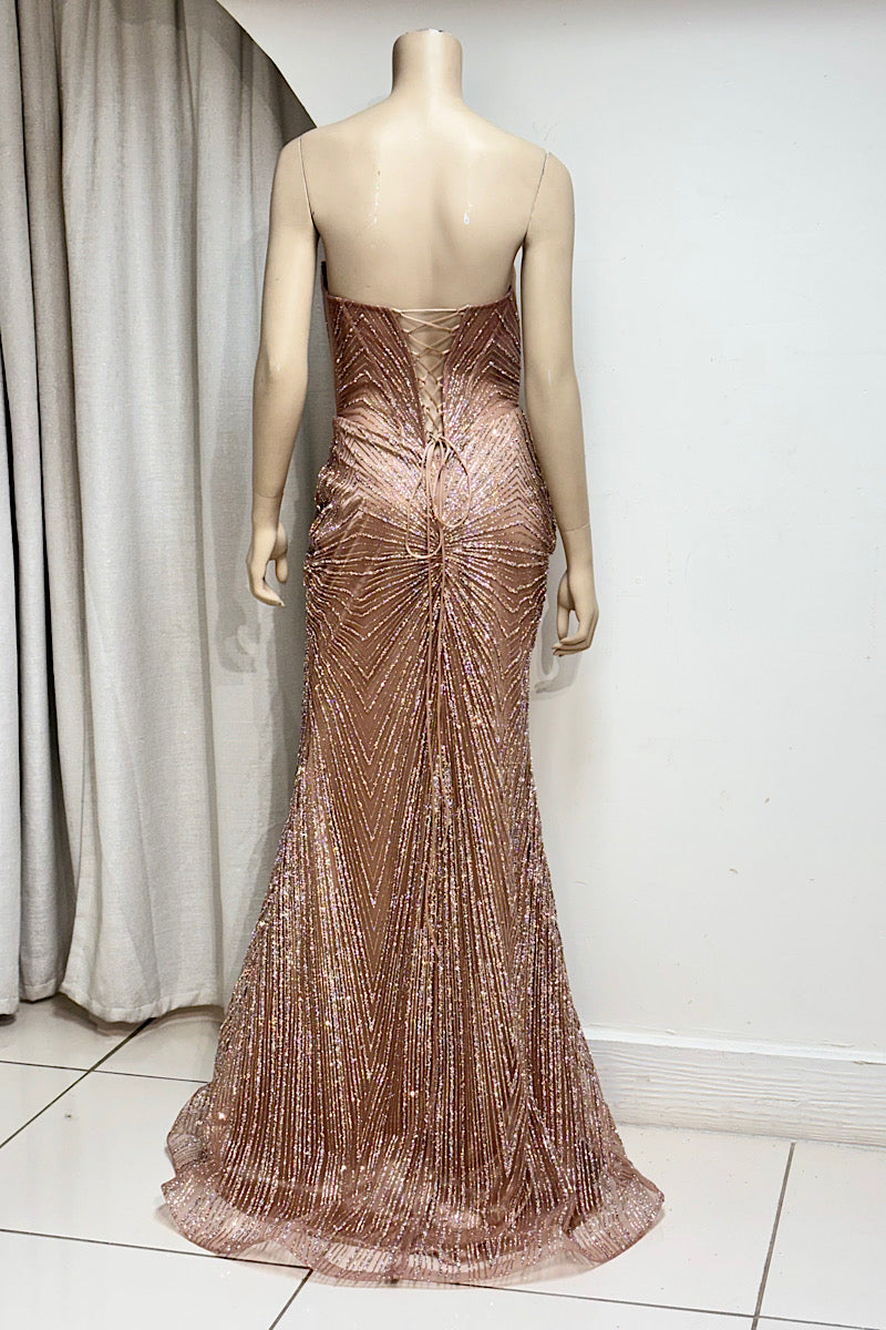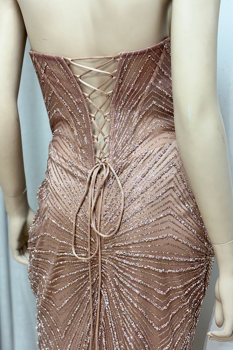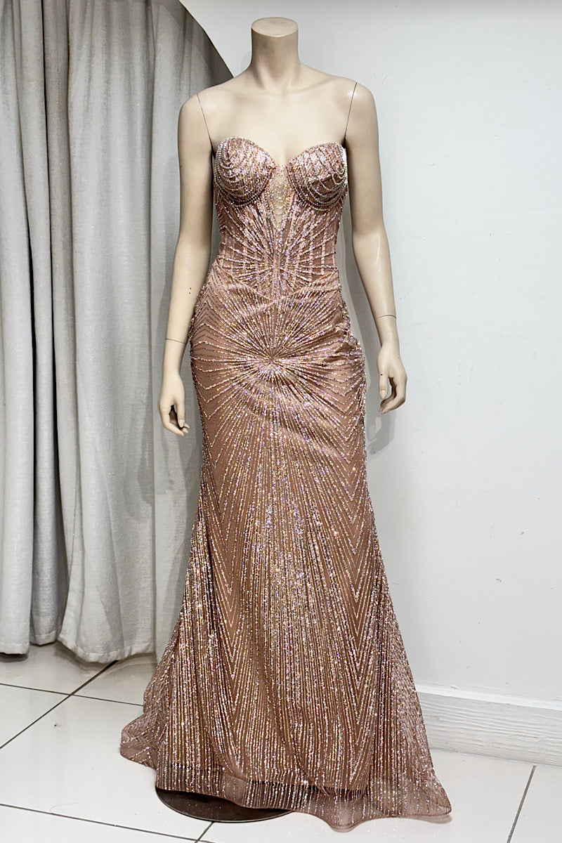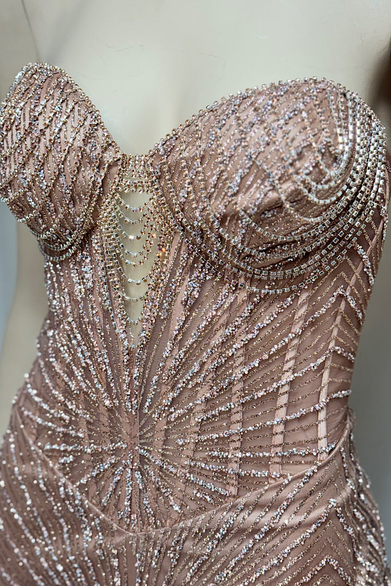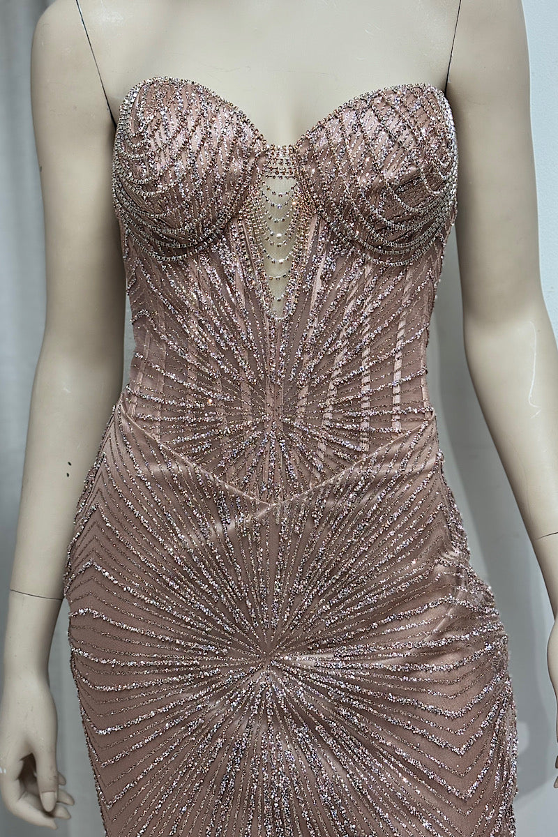Make a dazzling entrance in this beaded corset formal dress, featuring a shimmering mermaid silhouette that beautifully hugs your curves. The embellished details and draped cup design add refined elegance, creating a striking look perfect for unforgettable special occasions.