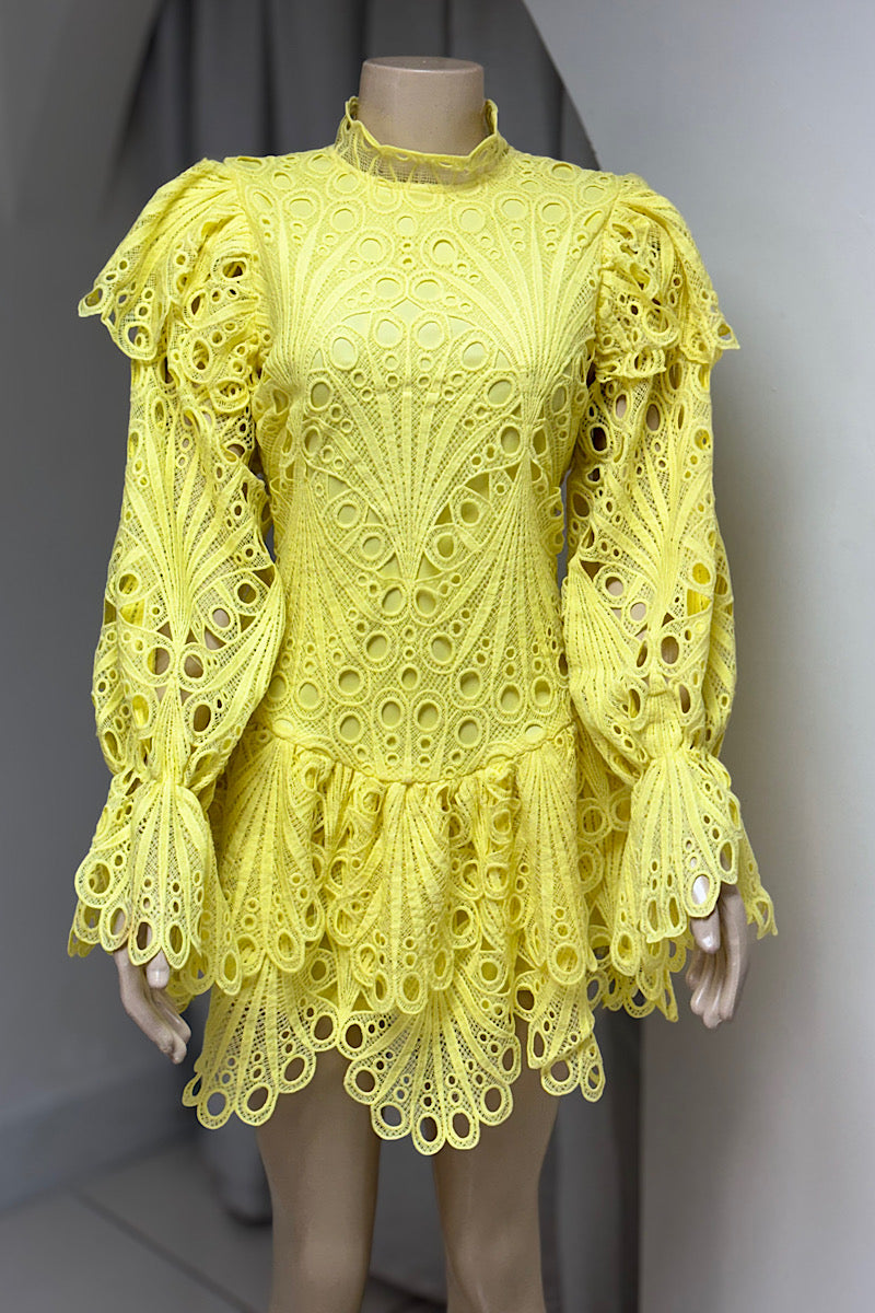 Brighten your wardrobe with the Eyelet High-Neck Mini Dress, available in vibrant Yellow and Teal. Featuring long sleeves and delicate ruffle details, this dress combines playful charm with a flattering silhouette for a stylish, standout look.