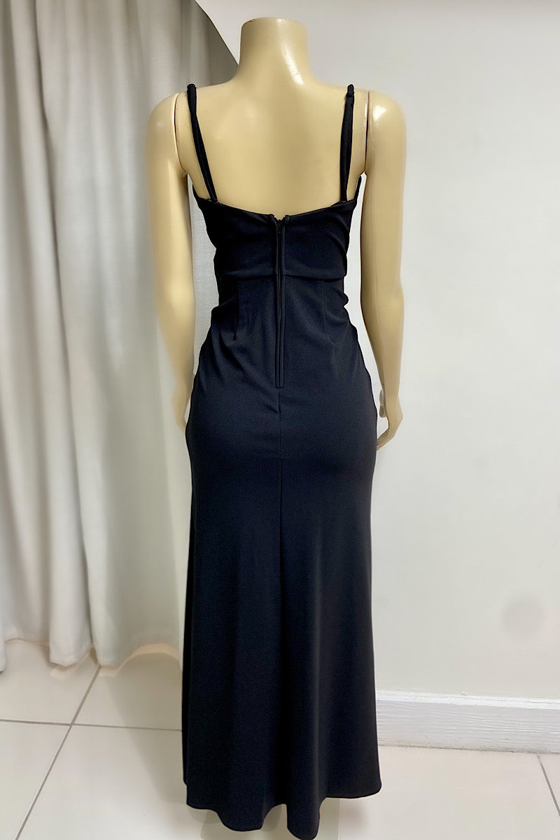 Make a striking impression with this fitted formal dress featuring delicate spaghetti straps and a daring high split. The exaggerated rhinestone bow adds a touch of glamorous drama, perfect for turning heads at any special event.