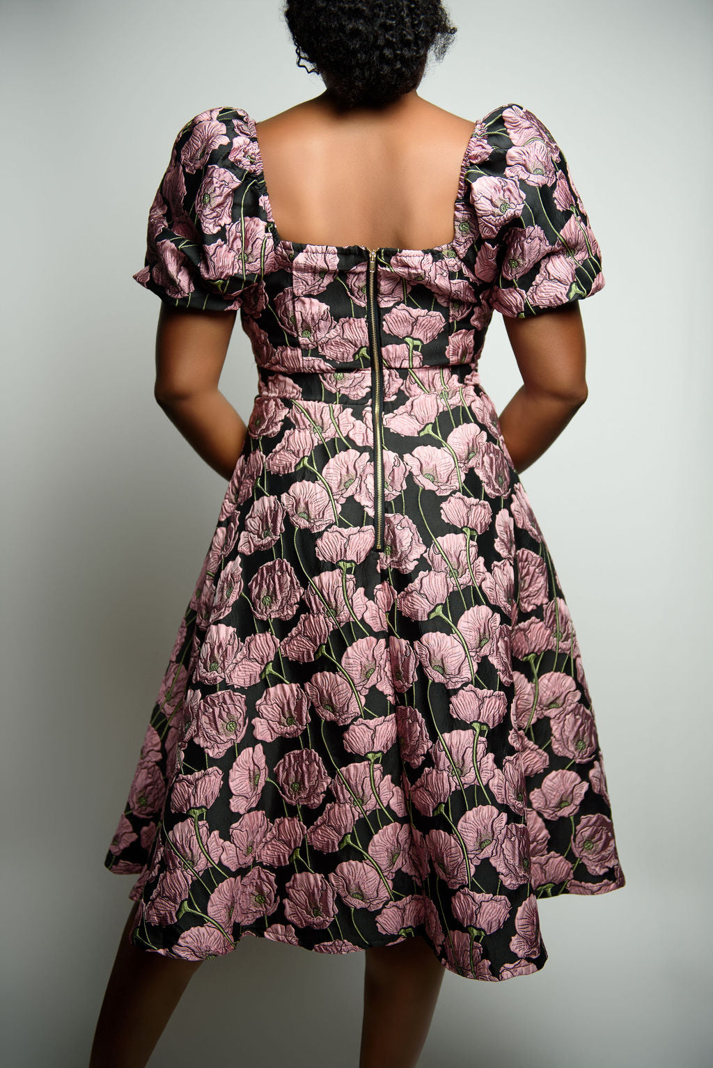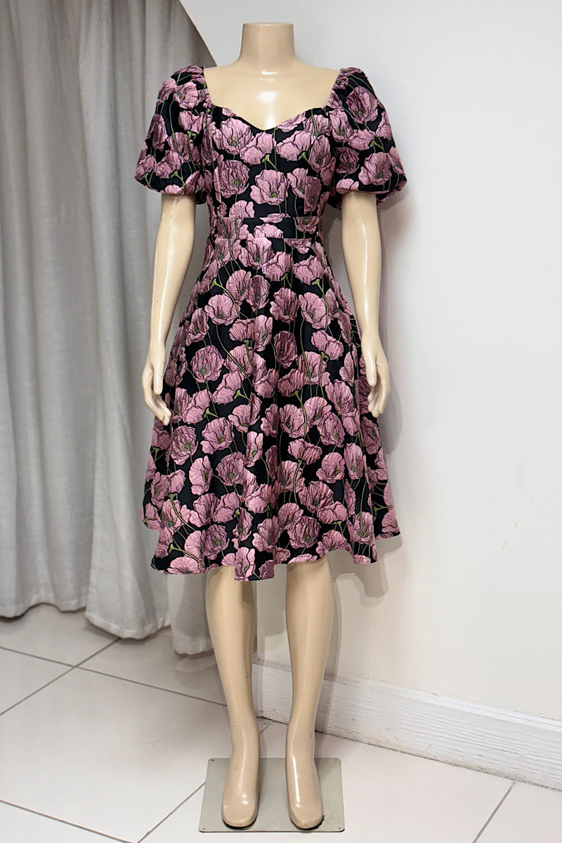 This knee-length dress features a striking black background adorned with vibrant pink flowers, creating a bold yet feminine look. The puff sleeves add a trendy, flattering touch, while the flare silhouette offers effortless movement and elegance. Perfect for making a stylish statement at any event.