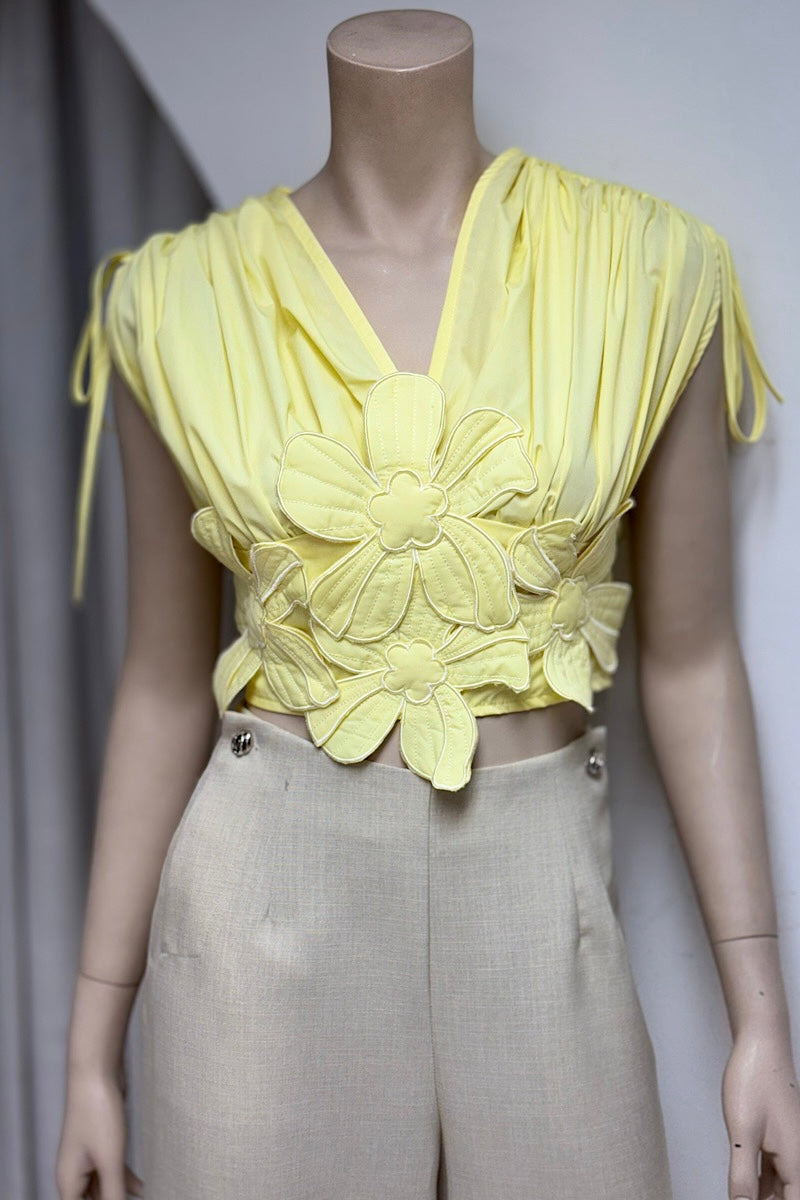 Enhance your style with the Flower Detail Crop Top, featuring a flattering V-neck and elegant tie shoulder accents. This chic design adds a feminine touch, perfect for creating playful and sophisticated outfits.