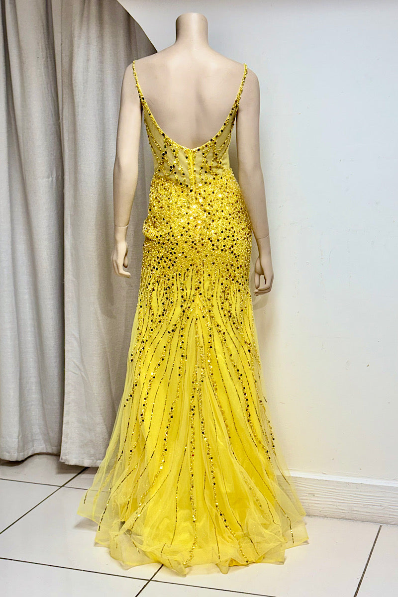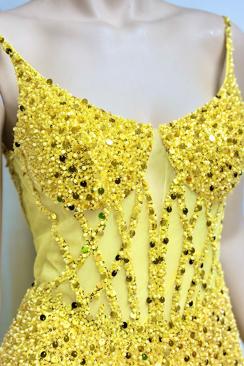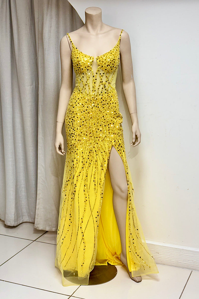 Make a stunning statement with the Full Beaded Spaghetti Strap Formal Dress, featuring a structured corset that enhances your silhouette. The high split adds a bold, elegant touch, while the intricate beading brings sparkle and sophistication to your look. Perfect for turning heads at any formal event.