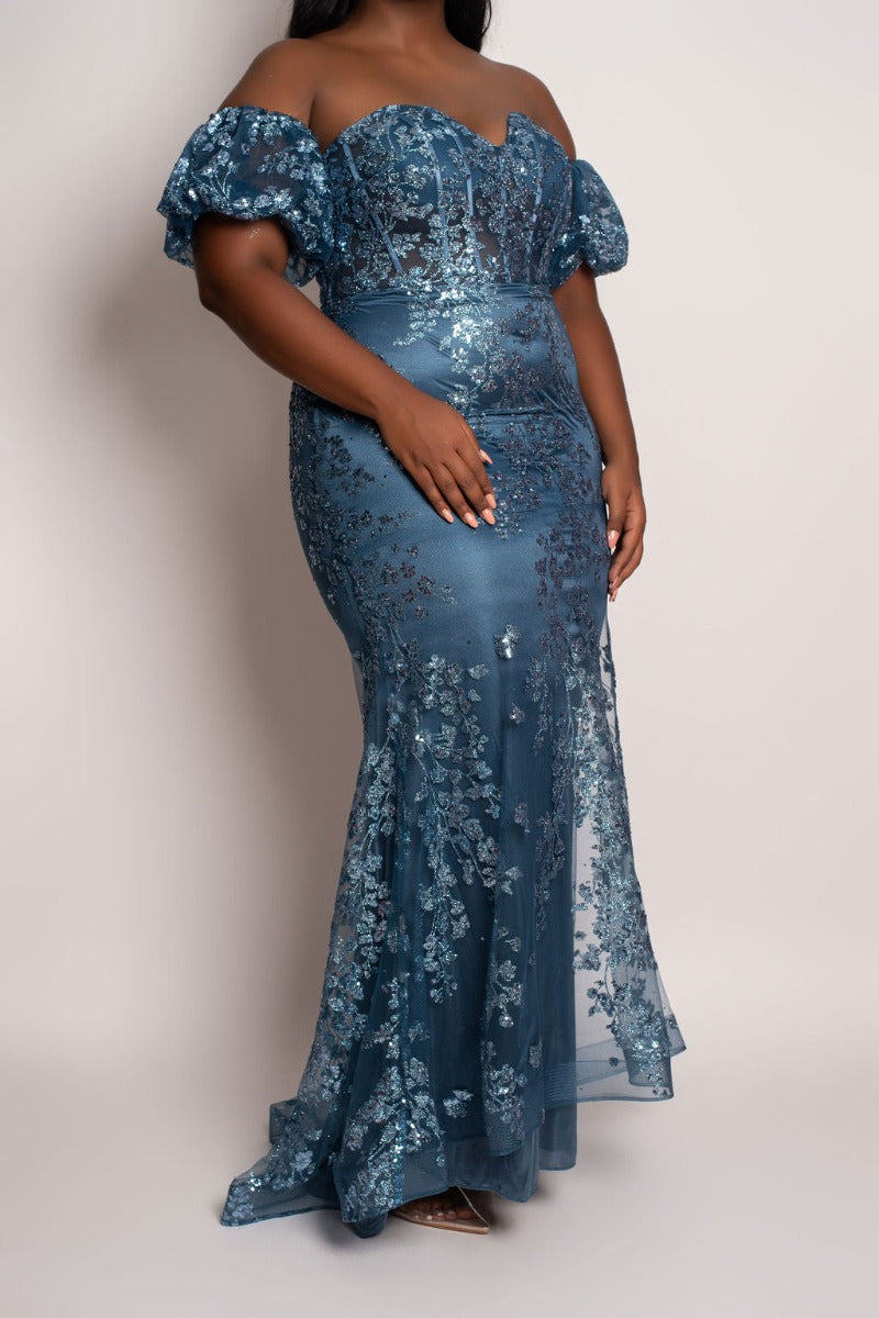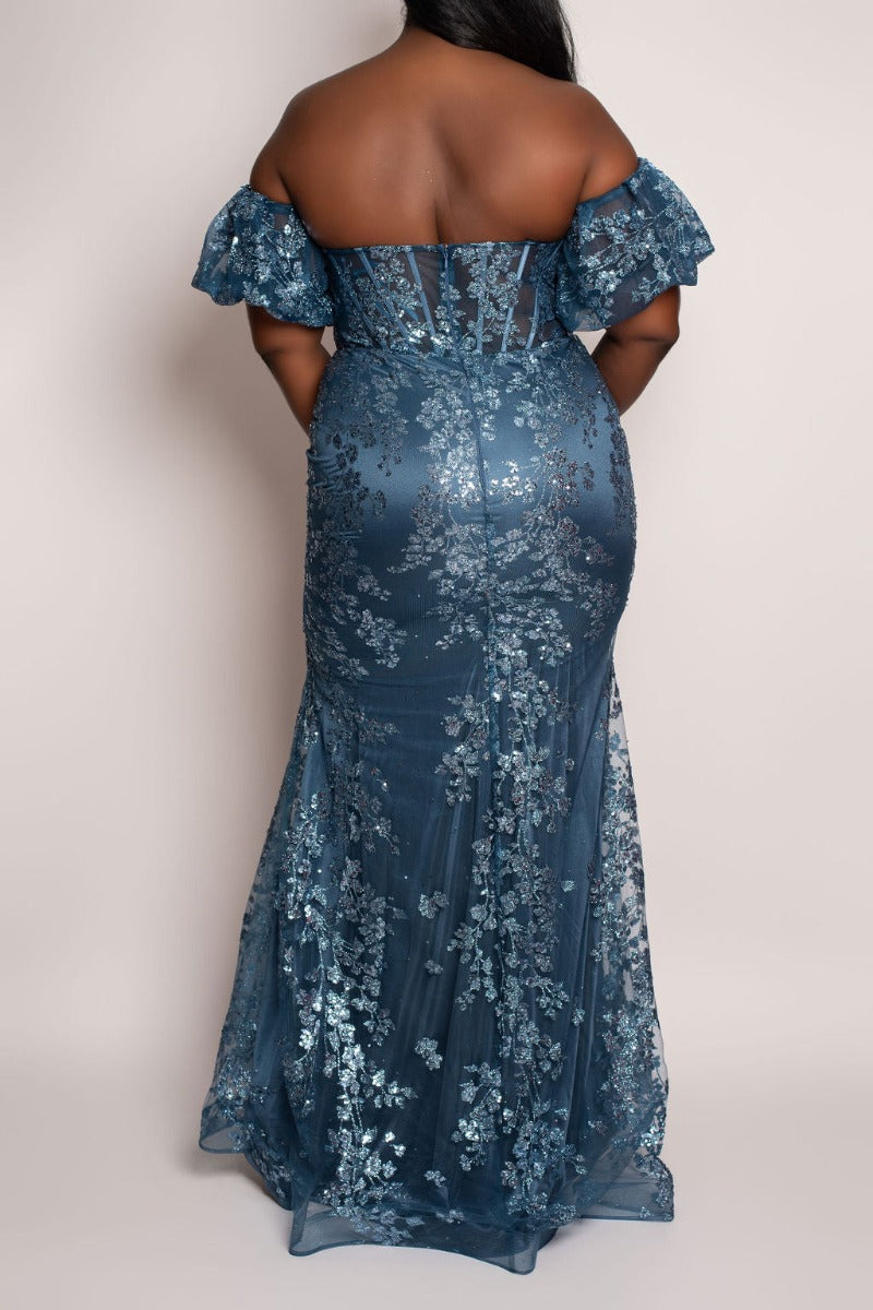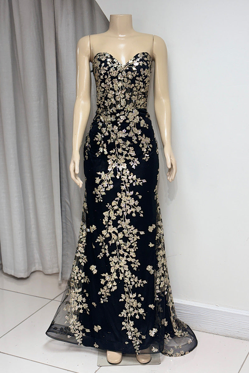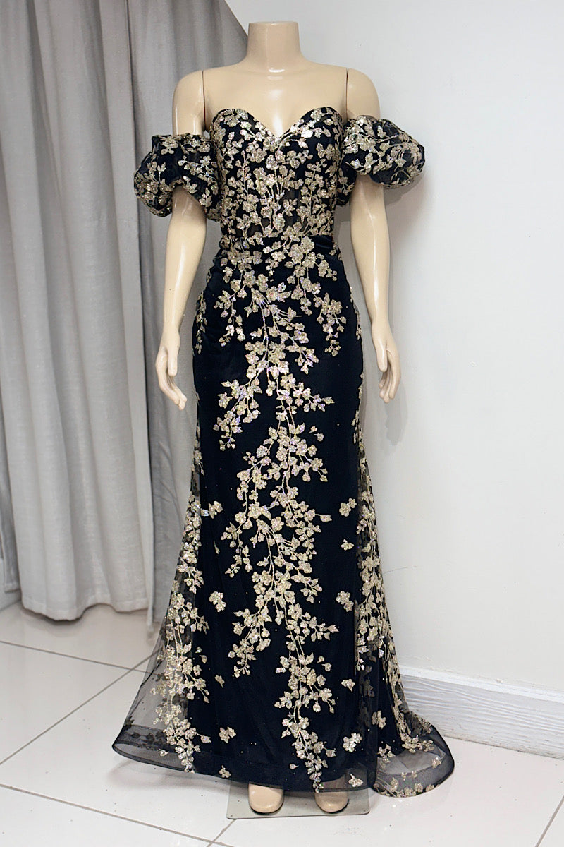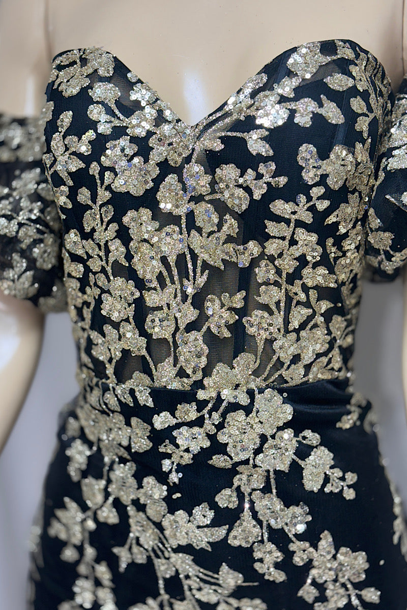 Make a stunning entrance with this Glitter Floral Print Formal dress. Featuring a captivating dusty blue or classic black and gold sequin shimmer, it combines elegance with sparkle. The sweetheart neckline enhances your silhouette, while detachable puff sleeves add versatile charm. The mermaid cut flatters every curve, creating a sophisticated and unforgettable look perfect for any special occasion.