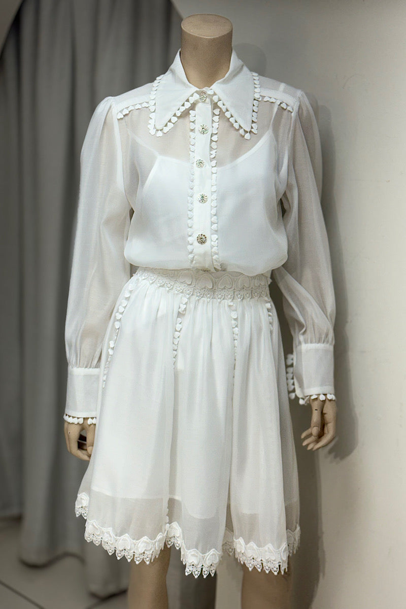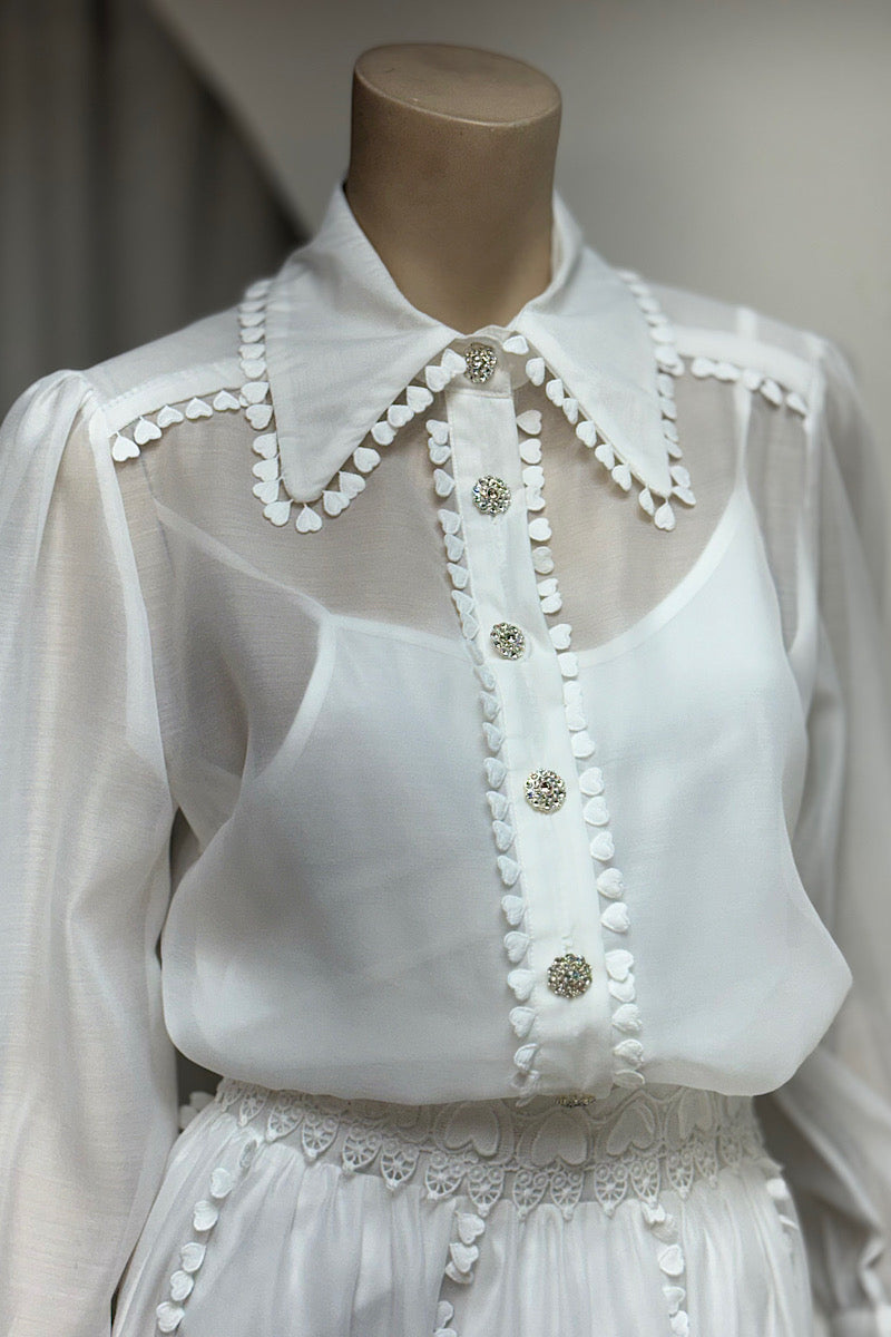 Elevate your style with the Heart Detailed Rhinestone Button Skirt Set, featuring a sheer long-sleeve collared top that adds a touch of elegance and sophistication. Perfect for making a chic, confident statement in any setting.
