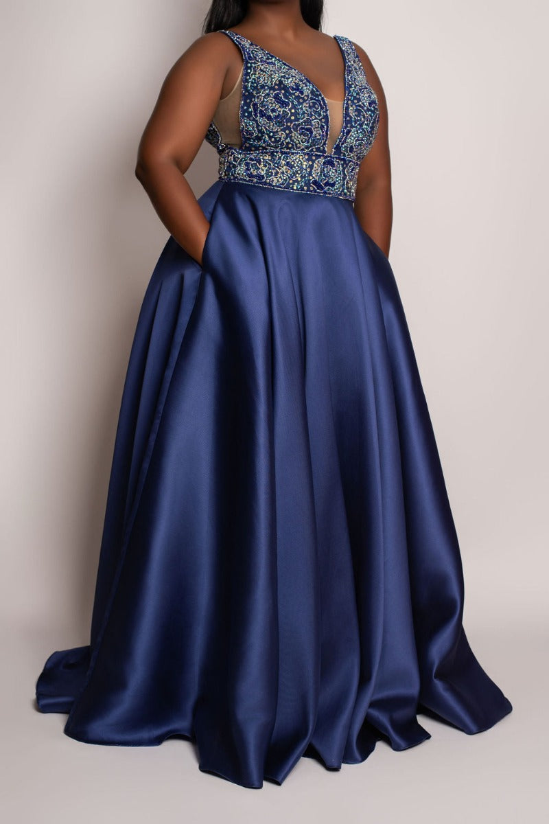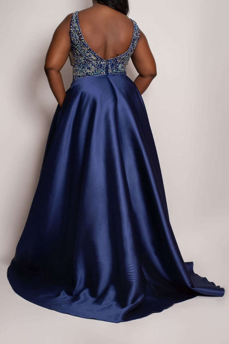 Shine brilliantly in this formal gown featuring a dazzling jeweled top design that captures the light from every angle. The iridescent finish adds an enchanting glow, ensuring you stand out with elegance and grace at any special event.
