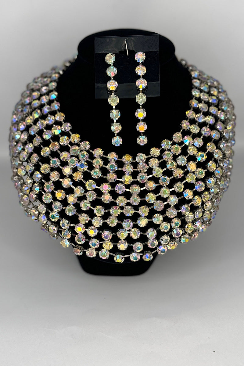 Make a dazzling impression with the Jewelry Set from our Silver Iridescent Collection. Featuring a big necklace adorned with circular rhinestones and matching long drop earrings, this extravagant set showcases shimmering silver iridescence for a radiant, standout look that elevates any special occasion ensemble.