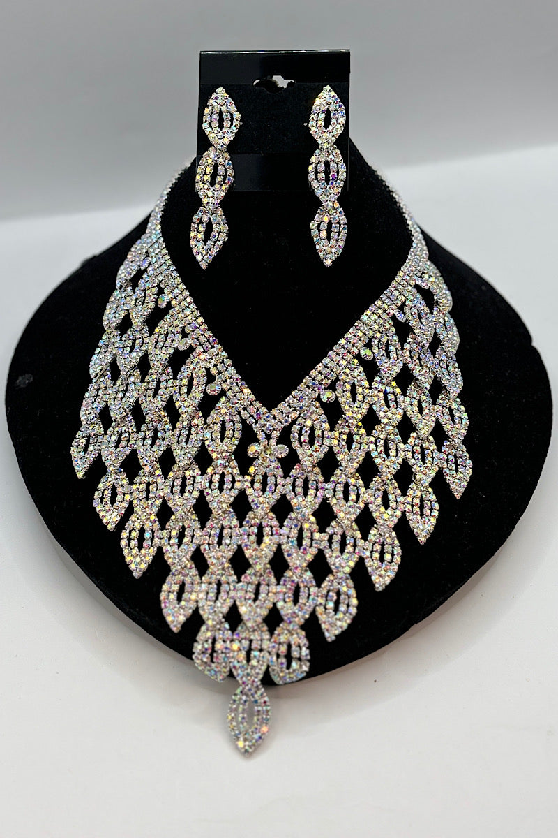 Complete your formal ensemble with this extravagant jewelry set from the Silver Iridescent Collection. Featuring a big necklace adorned with shimmering small stones and matching long earrings, this set brings sophisticated sparkle and bold elegance to elevate any special occasion look.