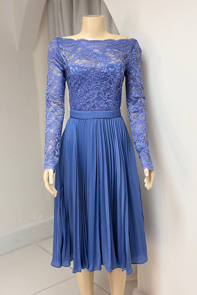 Elevate your elegance with the Lace Top Pleated Dress. Featuring delicate lace details, a wide neck, and long sleeves, this mid-length dress is available in small and medium sizes for a refined, flattering fit perfect for any occasion.