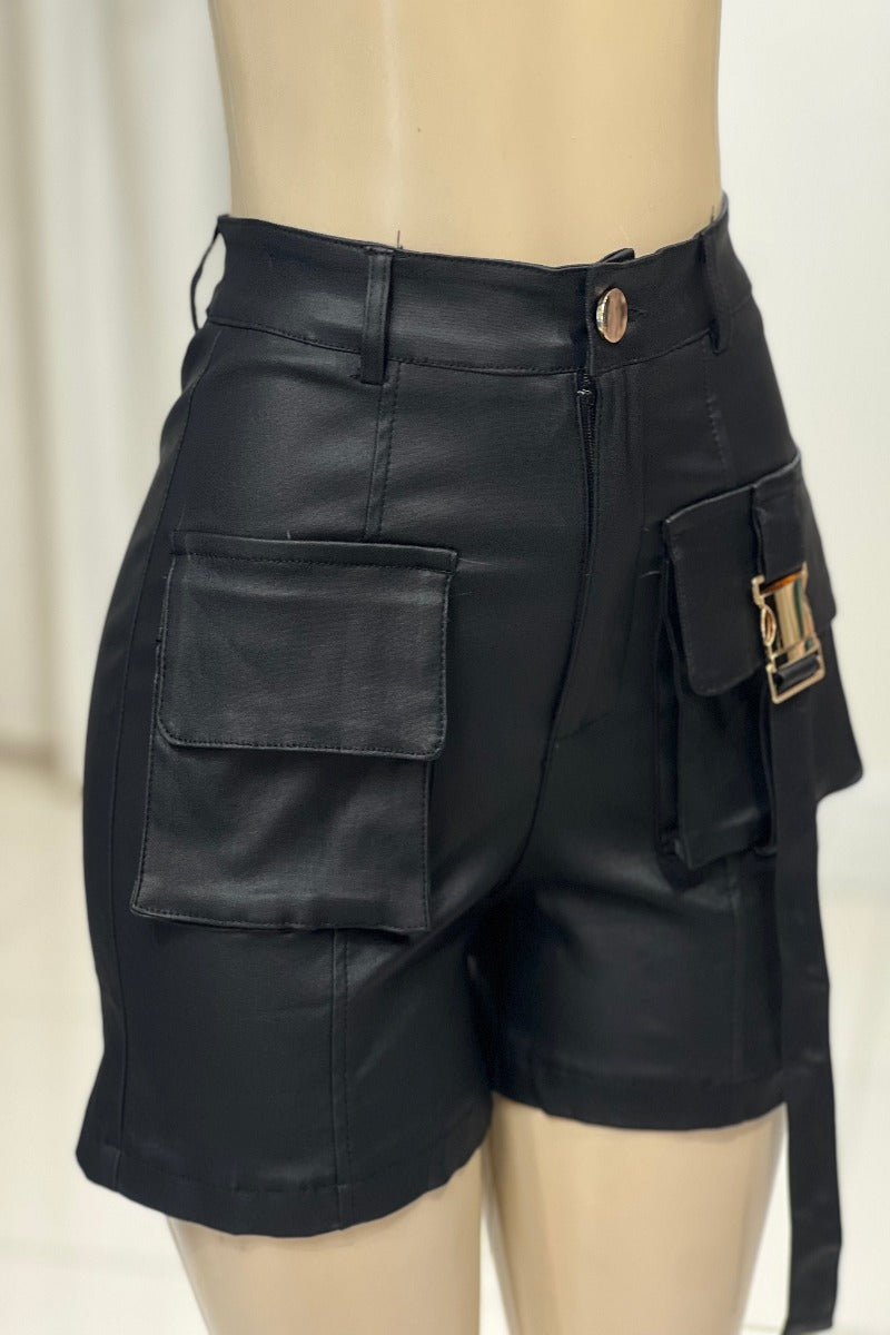Make a statement with the Faux Leather Cargo Shorts. These high-waisted, fitted shorts feature spacious big pockets, combining edgy style with practical functionality for a bold, modern look.