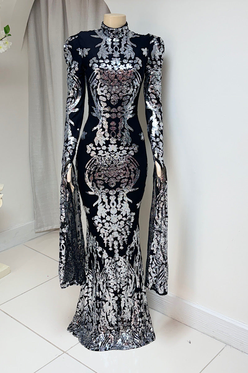 This elegant formal dress is perfect for any special occasion. The long exaggerated sleeves add a touch of sophistication, while the black and silver color combination exudes a sense of glamour.