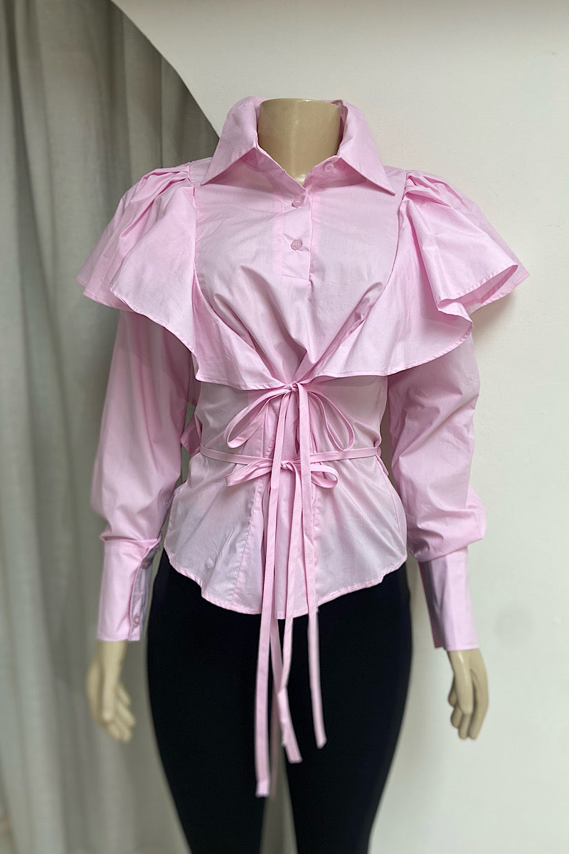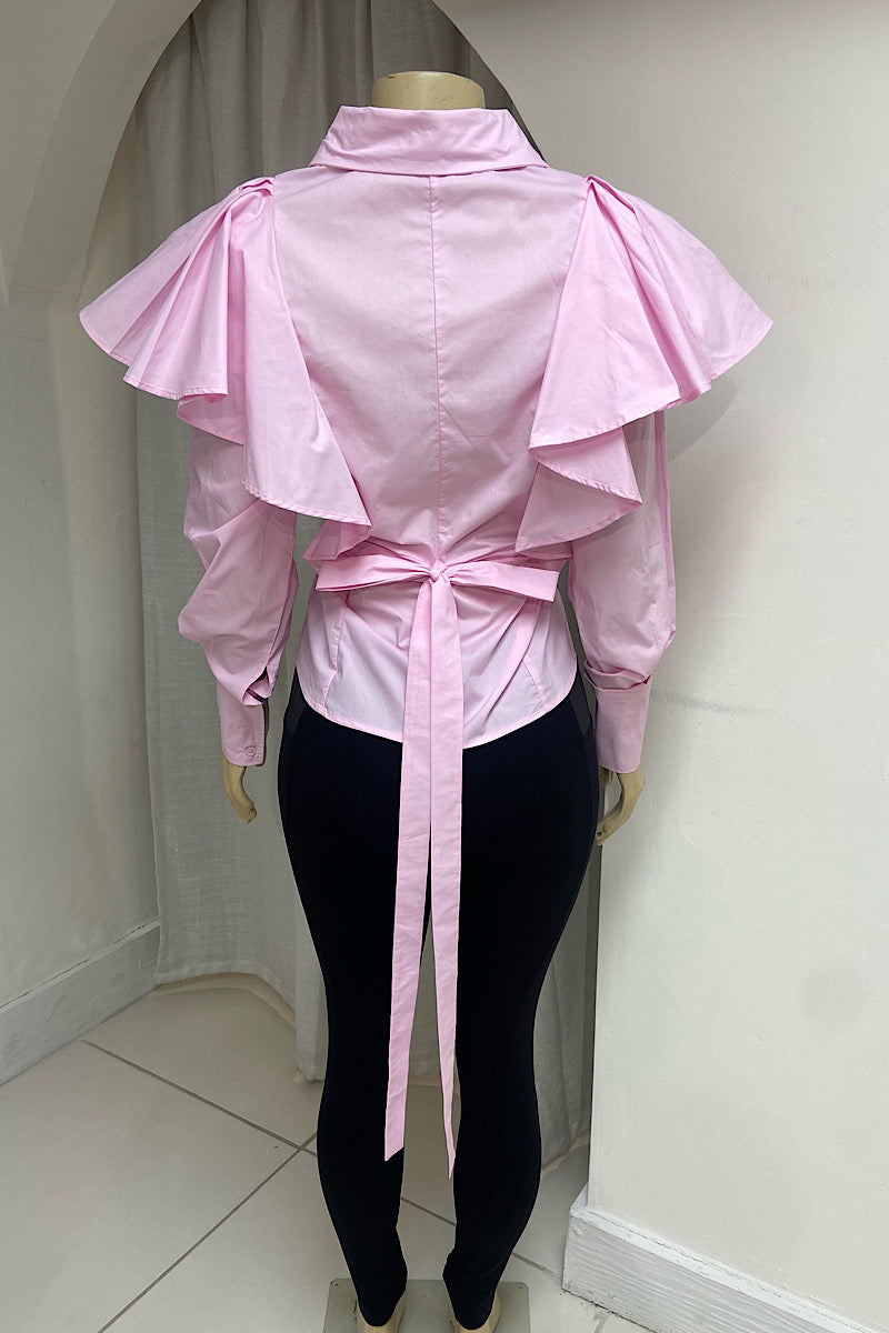 Elevate your wardrobe with this long ruffle sleeve top featuring elegant button-up detail and charming tie accents. The ruffle shoulders add a stylish, feminine touch, making it a perfect choice for dressing up or adding flair to your everyday look.