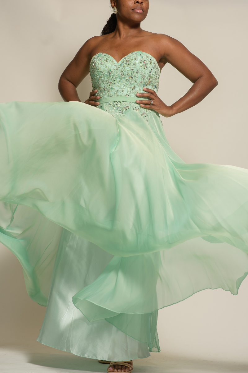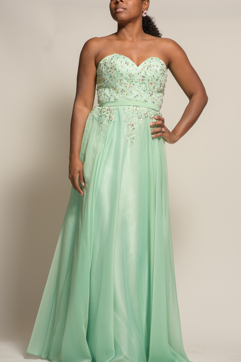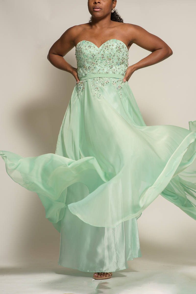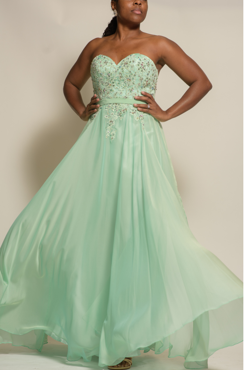 Experience grace in the Embroidered Flowy Tube Formal dress. Crafted from soft chiffon, it features a romantic sweetheart neckline adorned with delicate floral embroidery and sparkling iridescent rhinestones, creating a stunning, ethereal look.
