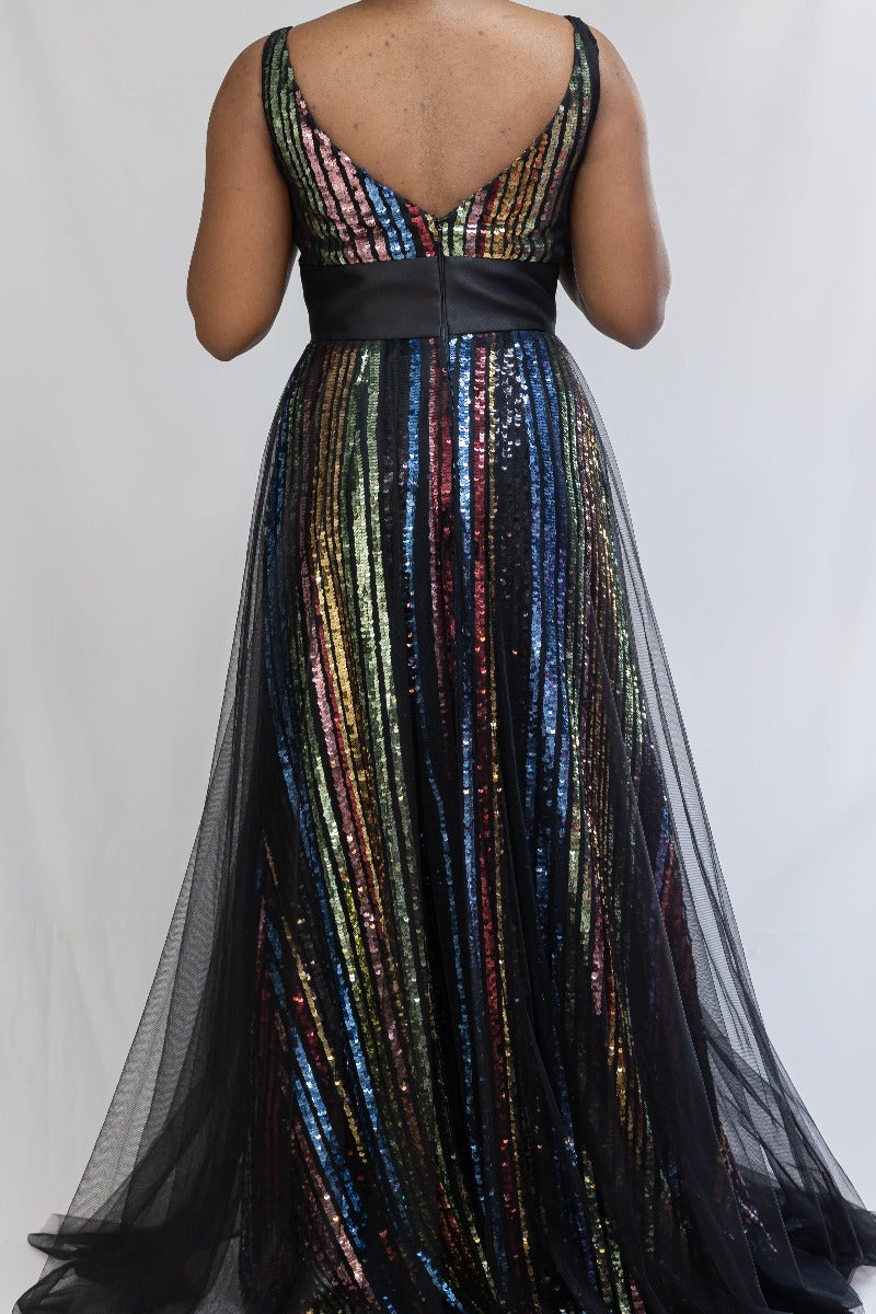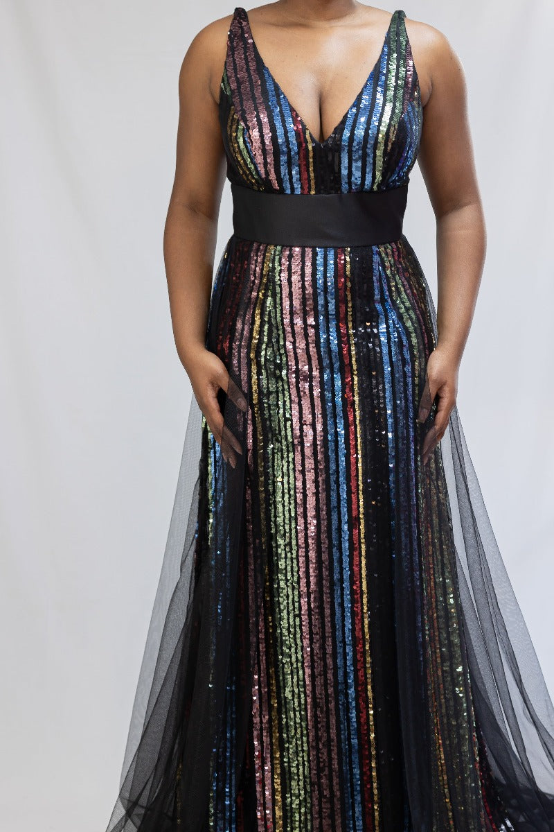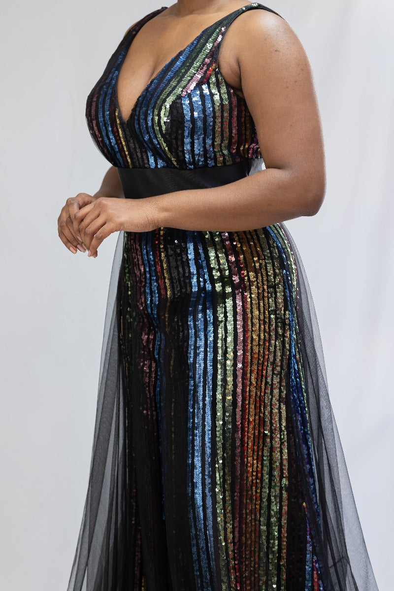 Shine bright in the Multicolored Sequin Flare Formal Dress, featuring a flattering V-neck and a dramatic tulle overlay. The mermaid silhouette is cinched with a thick black waistband, highlighting your waist while adding bold contrast. Covered in vibrant sequins, this dress ensures you'll capture attention and sparkle at any special occasion.