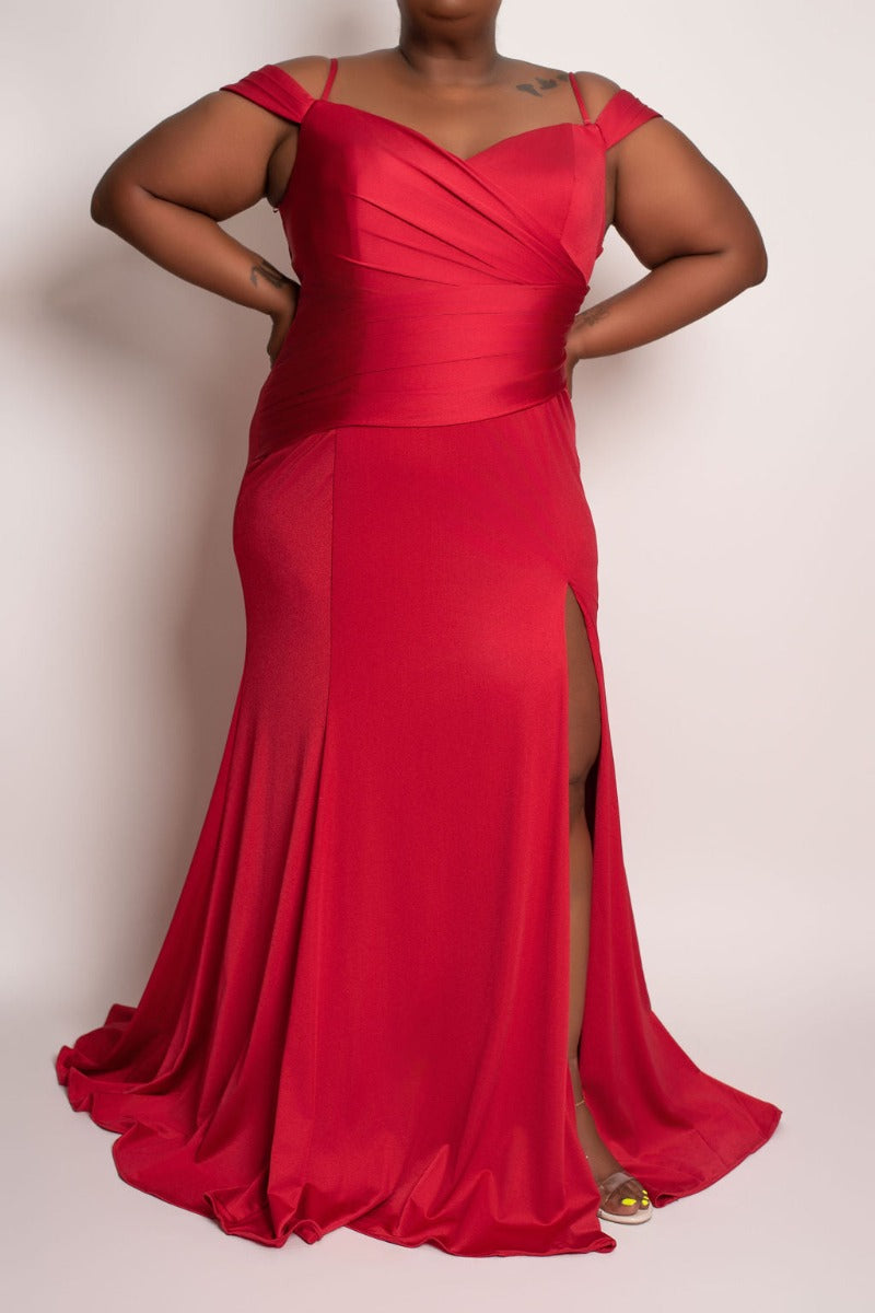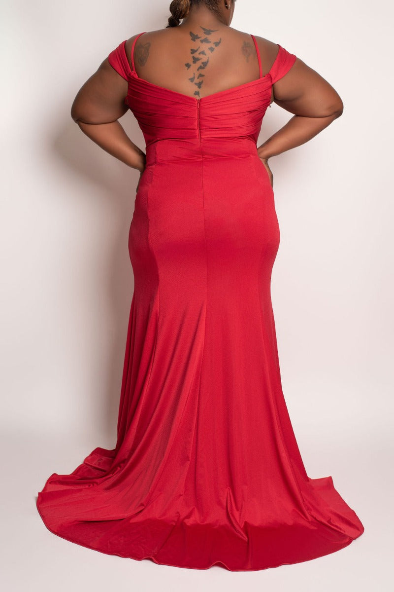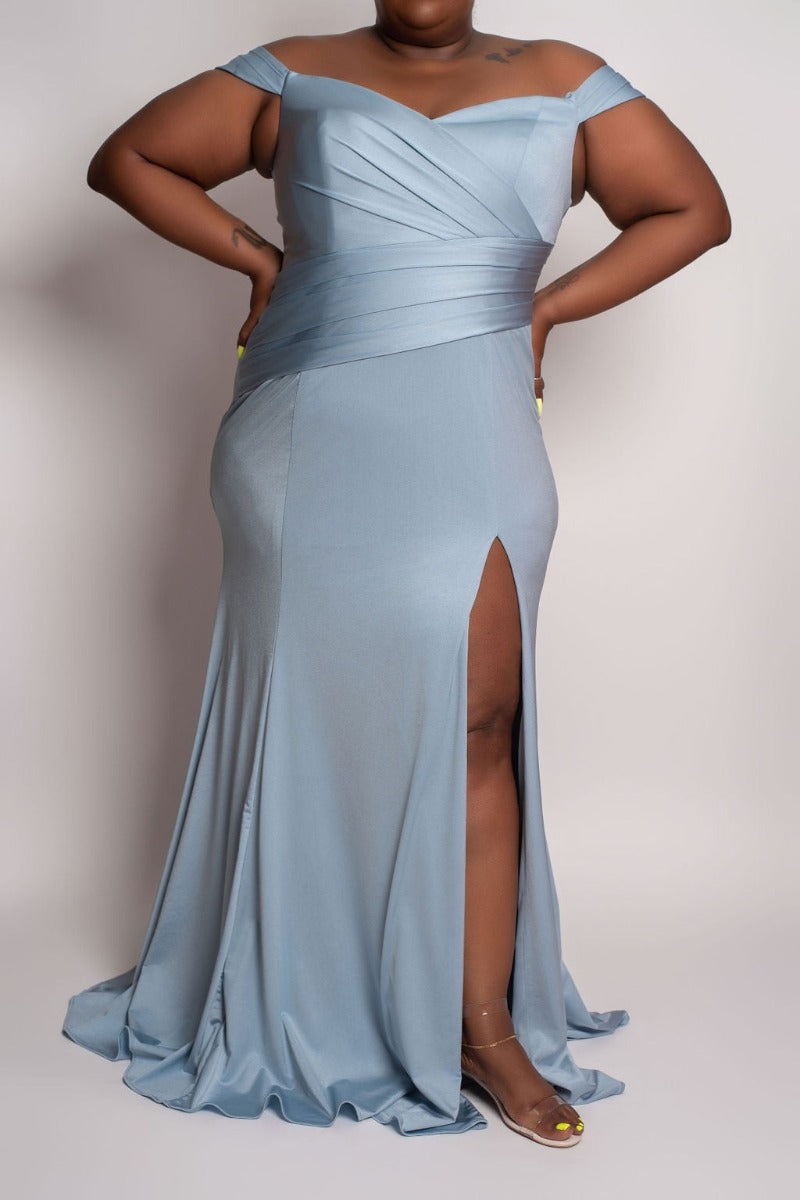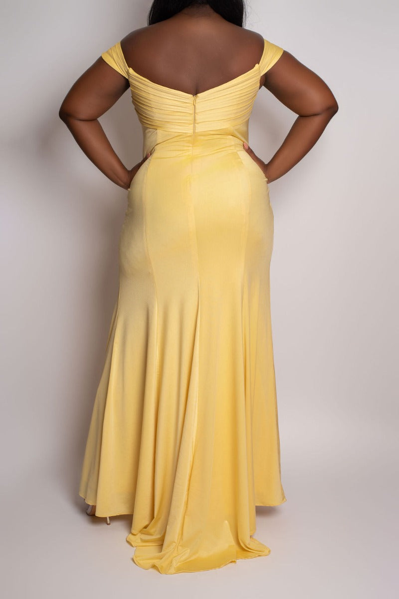 Celebrate your curves in this plus-size off-shoulder ruched formal dress, available in vibrant yellow, soft dusty blue, and rich cranberry. The fitted silhouette with a high split and flowing trail combines elegance with a touch of daring, creating a stunning look that’s perfect for any special occasion.