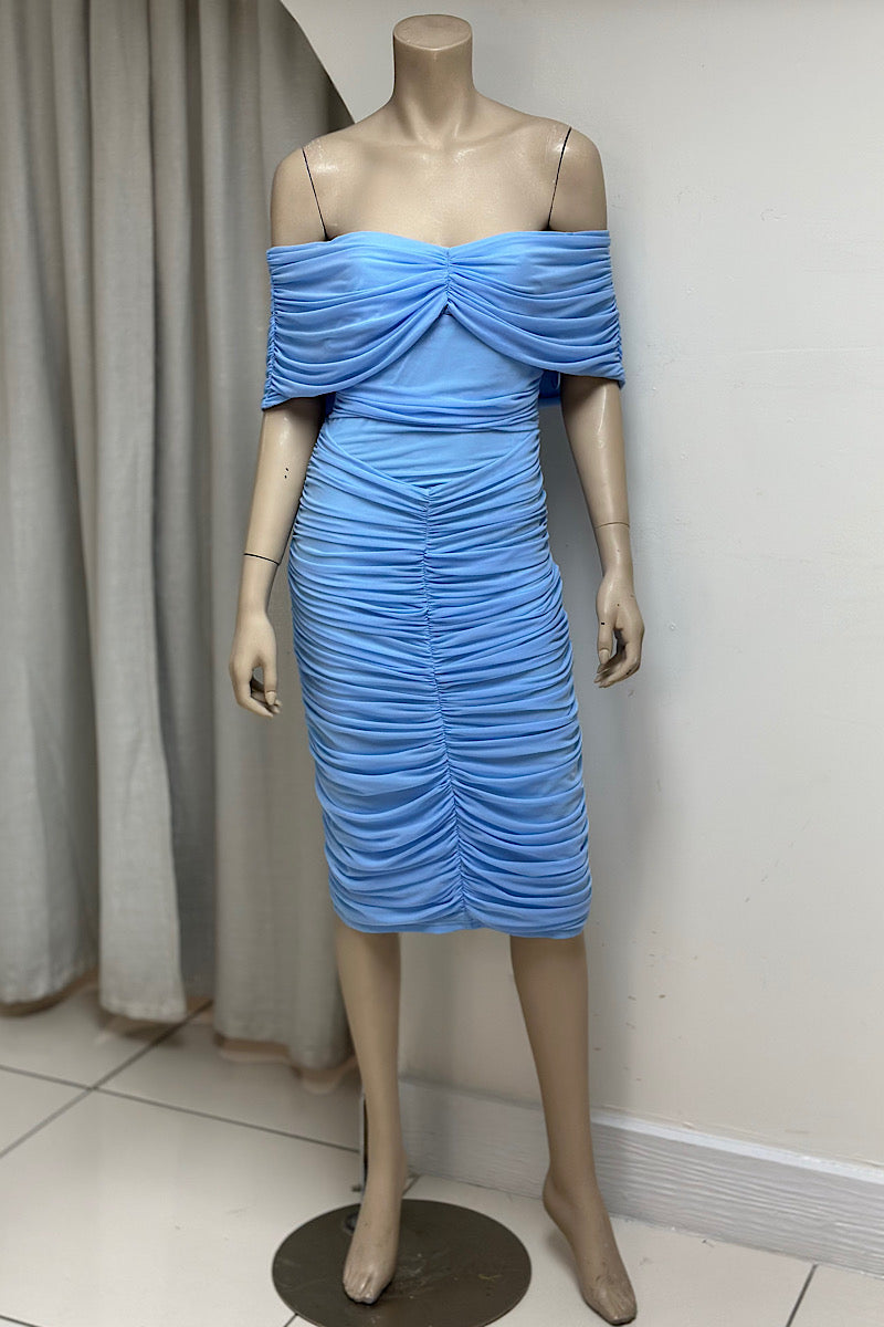 The Off-Shoulder Ruched Midi Dress features a ruched design and off-shoulder neckline, combining elegance with comfort. Ideal for semi-formal occasions, it is available in multiple colors to suit diverse preferences. The fabric fits effectively, enhancing the wearer's silhouette while providing ease of movement.