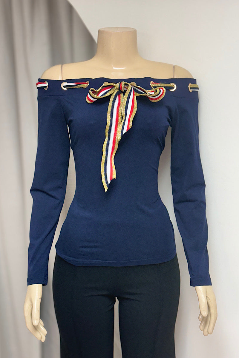 Turn heads in the Off Shoulder Top with Ribbon Bow, available in vibrant Yellow and Blue. This fitted long-sleeve top features a charming front ribbon and a stylish off-shoulder design, offered in small and medium sizes for a flattering, elegant fit.