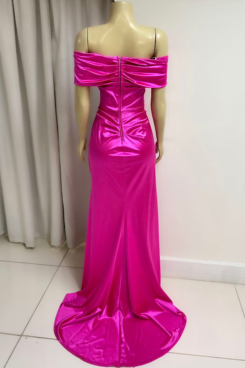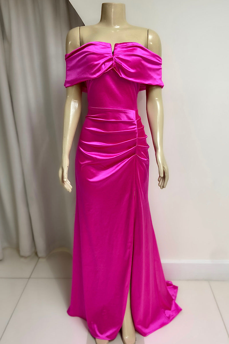 Exude elegance in this off-shoulder wired bust formal dress crafted from luxurious satin. The fitted silhouette features tasteful ruching and a V-wire detail that enhances your shape, while the high split and flowing trail add a dramatic, graceful finish perfect for any special occasion.