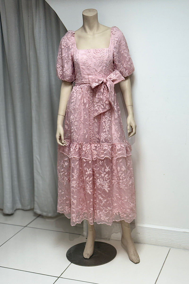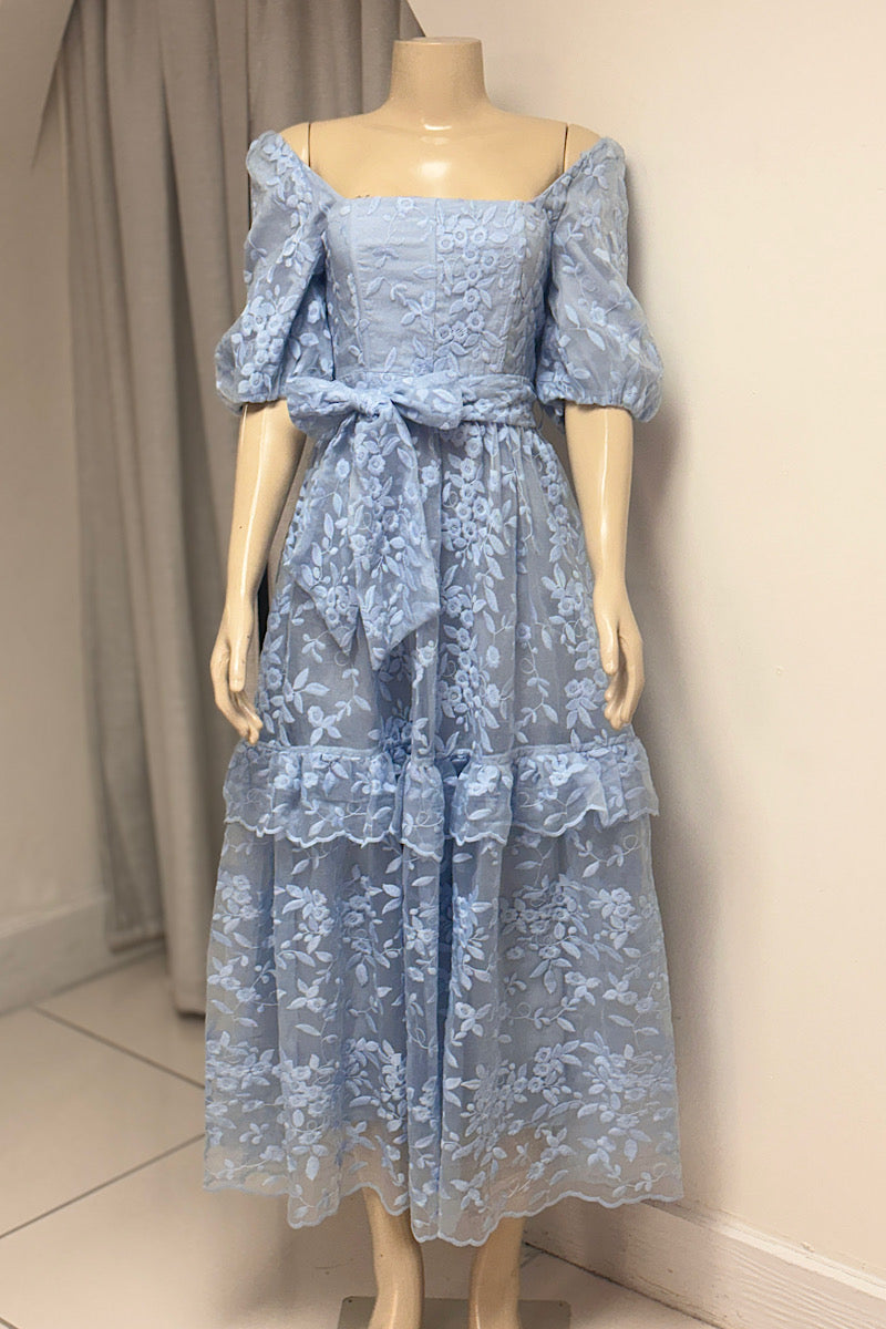 Step into elegance with this embroidered flower maxi dress, available in soft powder blue and dusty pink. Featuring charming puff sleeves and a flattering fit-and-flare silhouette, it beautifully enhances your shape. The tie-waist detail adds a personalized touch, making it perfect for both special occasions and stylish everyday wear.