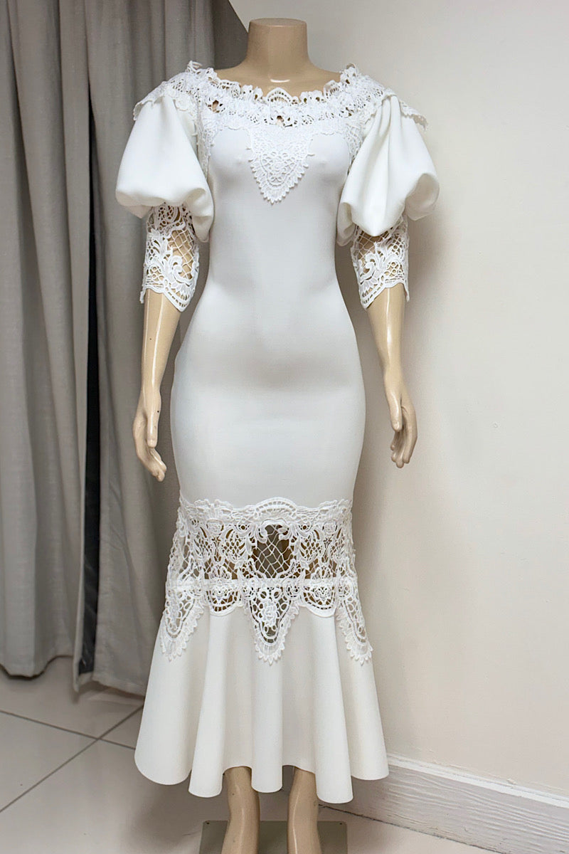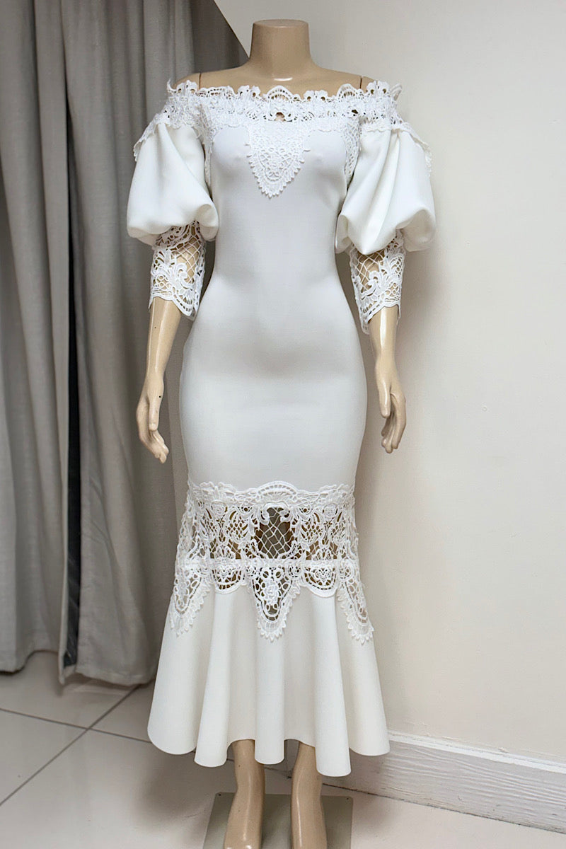 Turn heads in the Embroidered Lace Puff Sleeve Midi Dress. Featuring a fitted mermaid silhouette and a wide neckline, this dress showcases intricate lace embroidery for a stunning, sophisticated look that perfectly highlights your figure.
