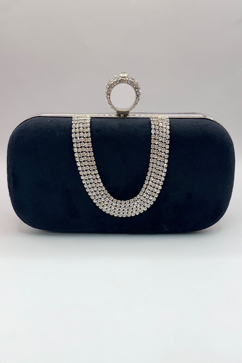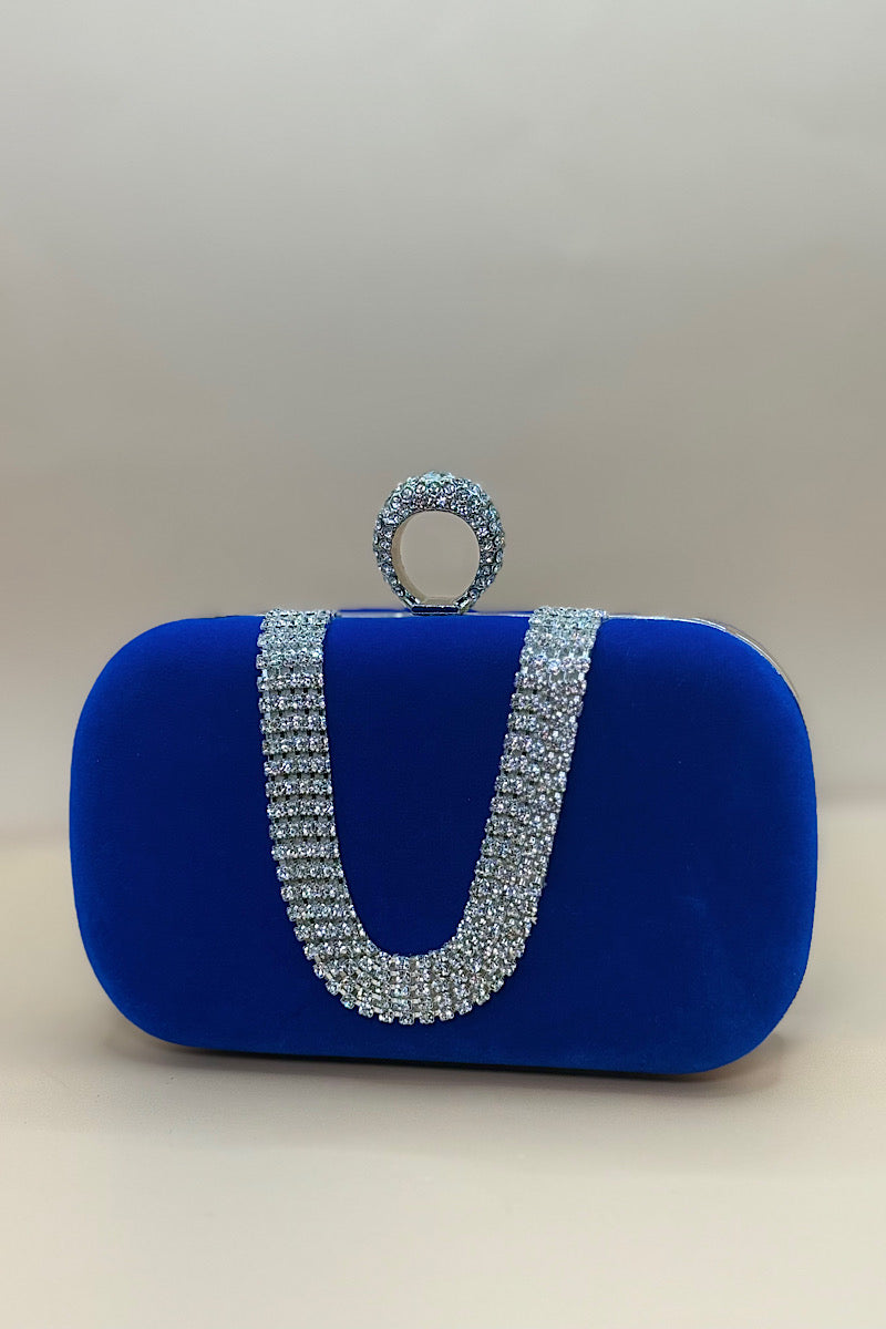 Elevate your evening look with this sophisticated suede ring clutch, designed for those who appreciate refined accessories. Crafted from luxurious suede and adorned with sparkling clear rhinestones, this mini bag combines elegance with eye-catching glamour. The distinctive ring handle adds a modern touch, making it both functional and fashionable. Available in timeless black and rich royal blue, this versatile clutch transitions seamlessly from cocktail events to upscale dinners. Perfect for carrying essentials while making a statement.