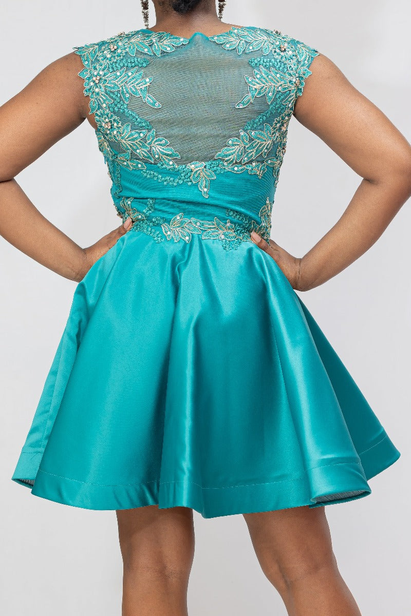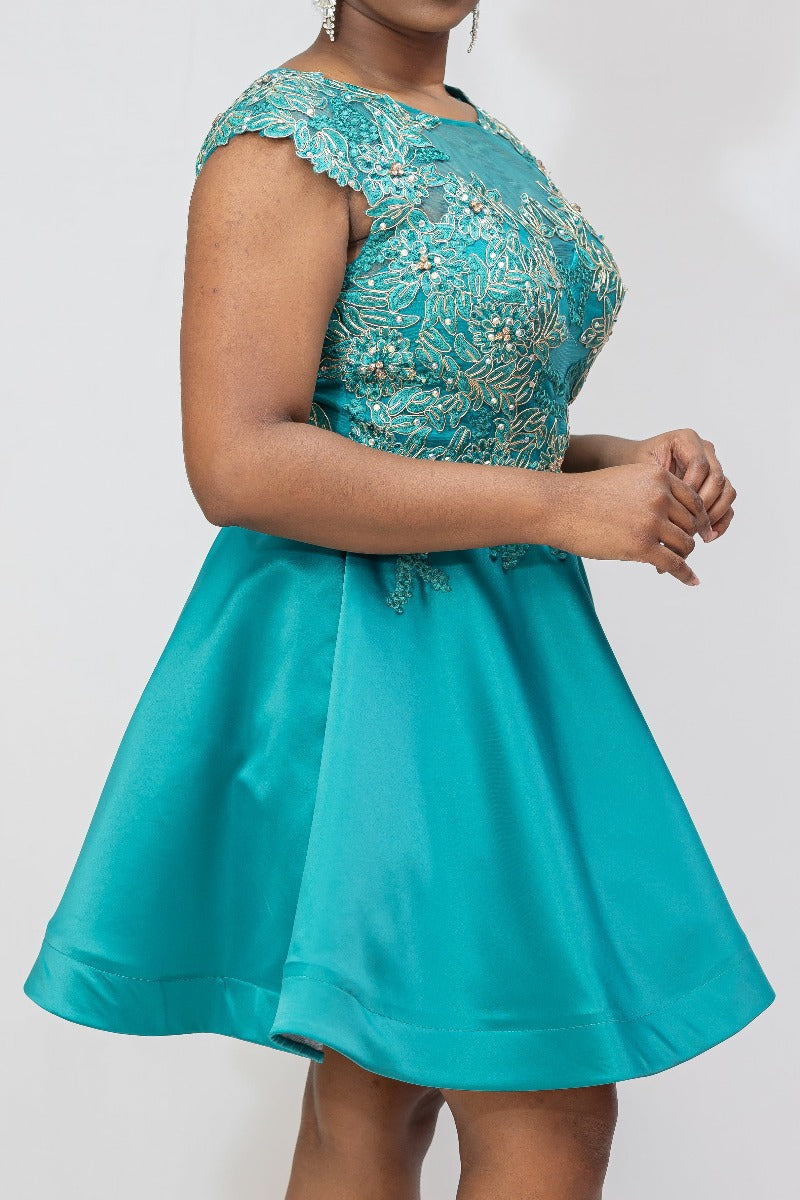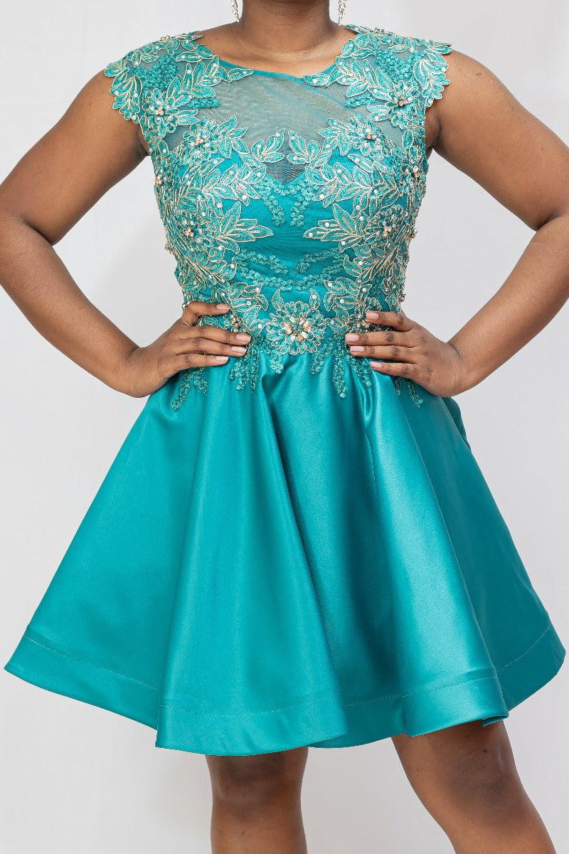 Step out in style with the Embroidered Sheer Chest Short Formal Dress. Designed in a flattering medium size, this elegant dress features intricate embroidery on the top half, combining timeless sophistication with a vibrant teal hue perfect for any special occasion.